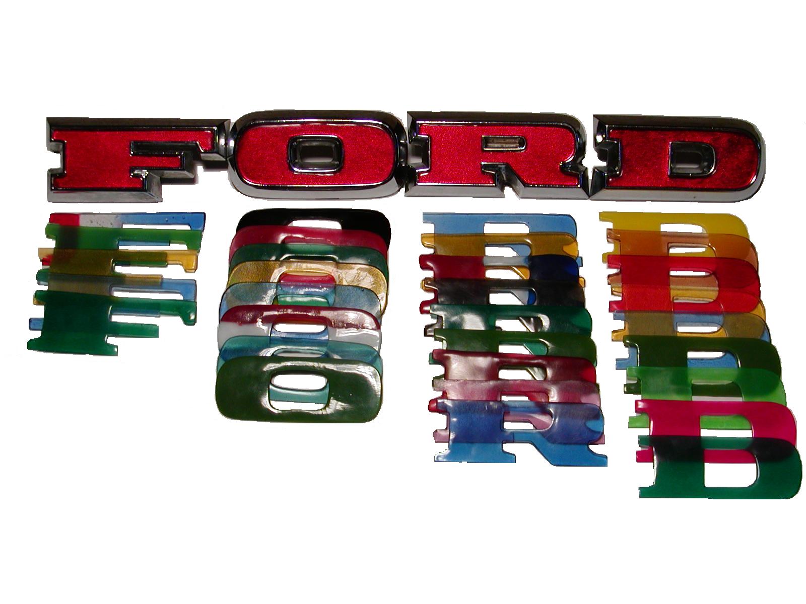 Welcome to My Early Bronco Page. This site is to showcase our F-O-R-D grill letter inserts that we make for the early Bronco. These inserts are a re-production of the original red inserts that came in the metal grill letters. We can make them in just about any color you would like to match or contrast with your Bronco's color scheme. We are also looking for different emblems that we can dress up, so if you have any suggestions send me an email and we'll see what we can do. Also, many people have purchased letters from us either through Ebay or Bronco Driver magazine and we would like to see some photos of them on your Bronco. If you have a picture send it to me and I'll put it up on the web site. Thanks for looking. These are a few new letter colors we've done for some cusotmers. The metal letters are sitting in a mold that we use for keeping the letters upright during the making of the acrylic inserts.